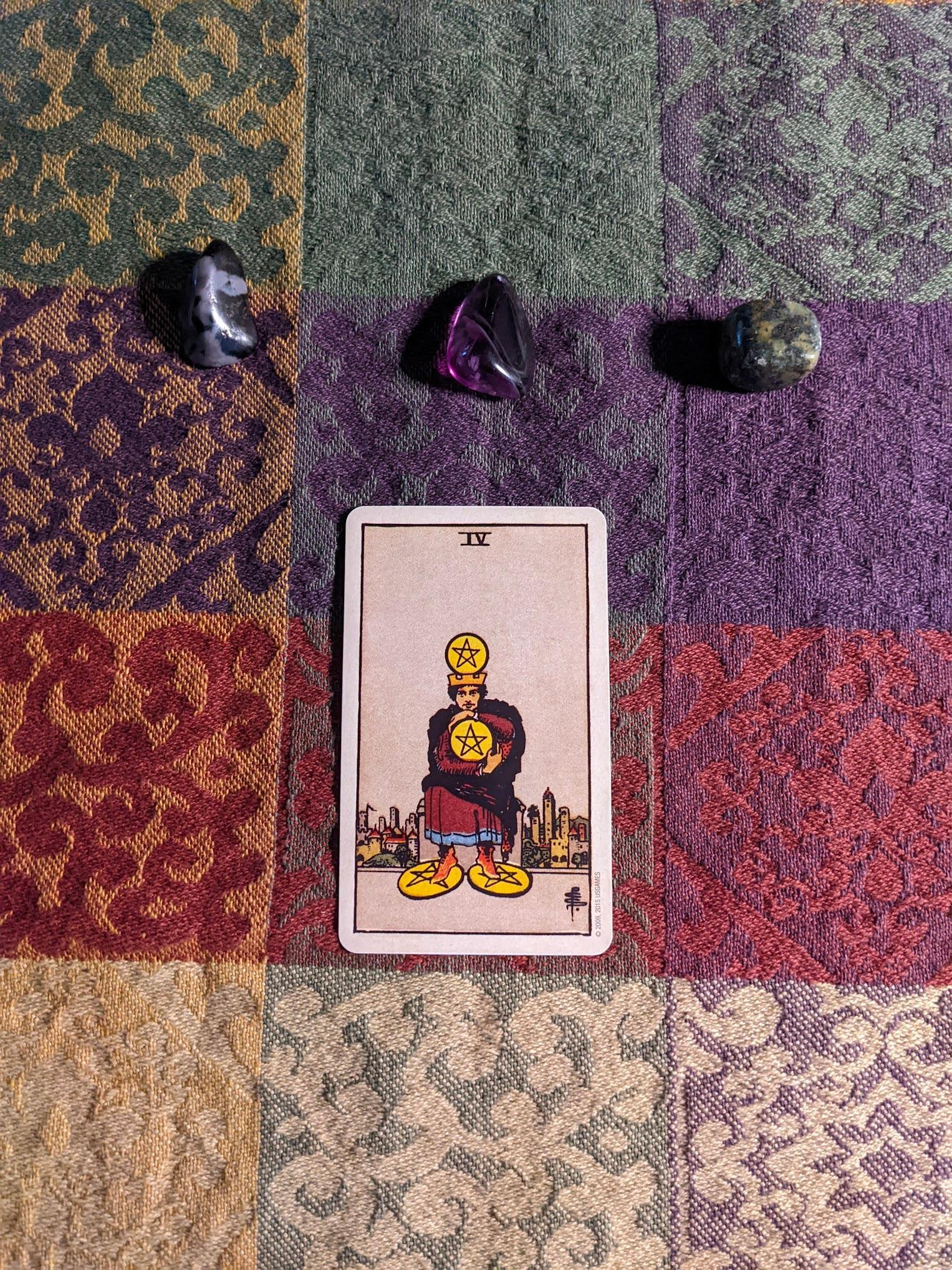 Since I was going to do a reading on an angel, I decided to put on something suitably vast and dramatic. I settled on Franssens: Harmony of the Spheres. I asked the god Hermes to act as liasion between myself and Tamiel. Something came to me spontaneously, and I drew a single card I called "the symbol at the gates". Its purpose was to gauge the nature of the actual container and experience I was about to enter into. I drew the Four of Pentacles: containers, protection, holding, boundaries, barriers.