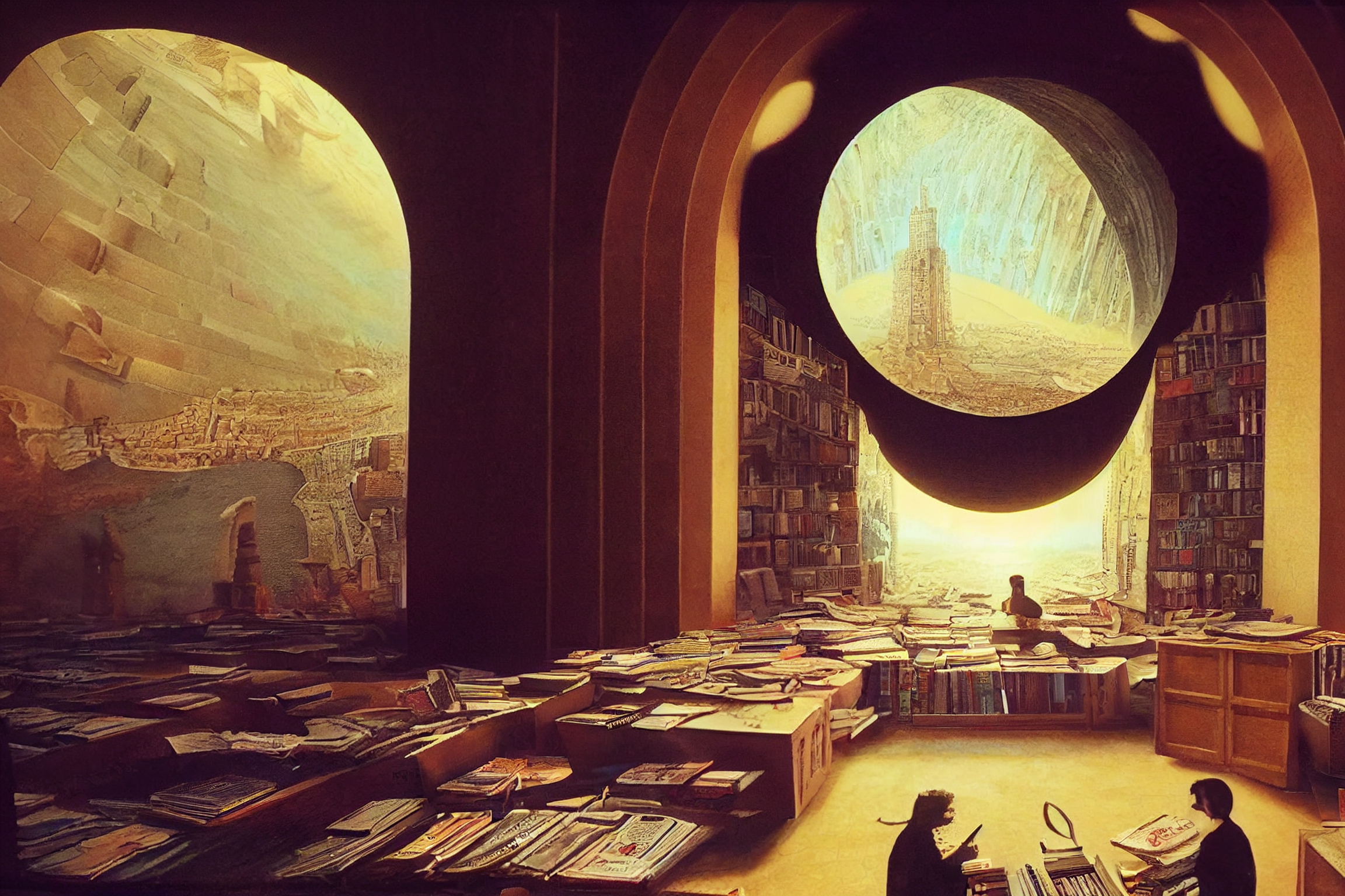 A few days later I returned to the tower, but this time Tamiel took me inside, up to the 4th of infinite floors. Inside were shelves upon shelves of books surrounding a huge floorspace dominated by a table with a gargantuan book covering the entire surface. I understood it to contain every landmass in the world, with many other books in the library detailing the individual areas of every inch of the earth, every blade of grass, every speck of dirt. Everything that had been and that could be.
