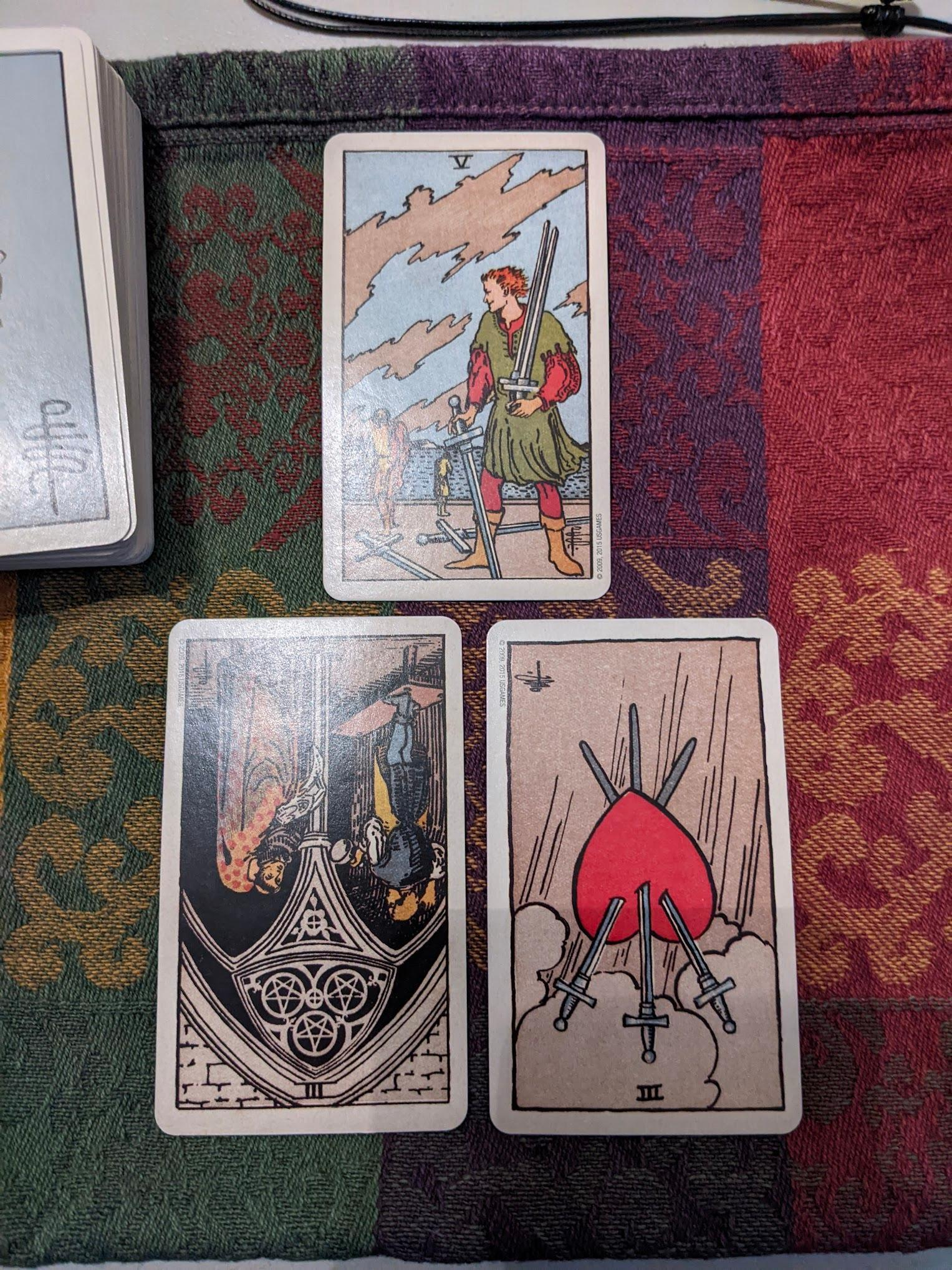 I spent some time calming and centering myself and pendulum-tested to ask "is Tamiel my HGA?" and received a firm yes. I decided to draw three cards, asking to be shown something which confirms its nature. I drew the Five of Swords, Three of Pentacles reversed, and the Three of Swords reversed3. At first it didn't make much sense to me.